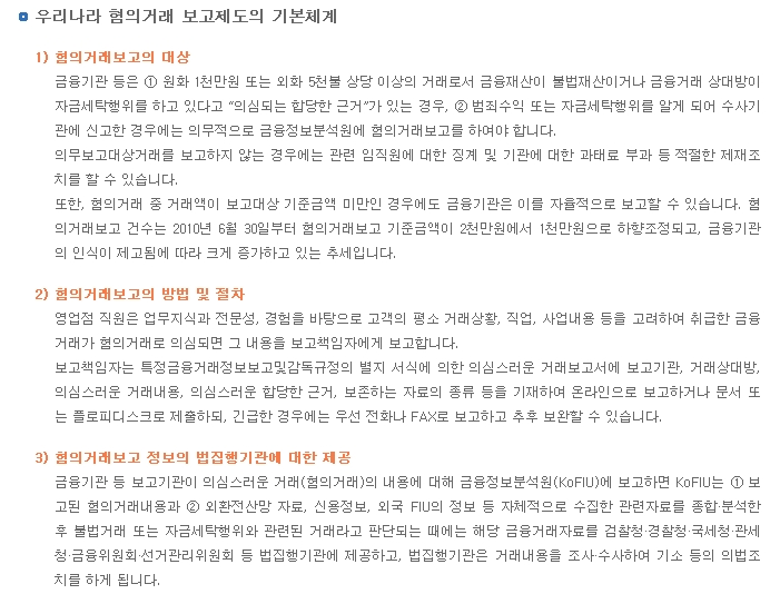 1. 혐의거래 보고제도 (판단주체는 금융회사 종사자이며, 그들의 주관적 판단에 의존하는 제도)