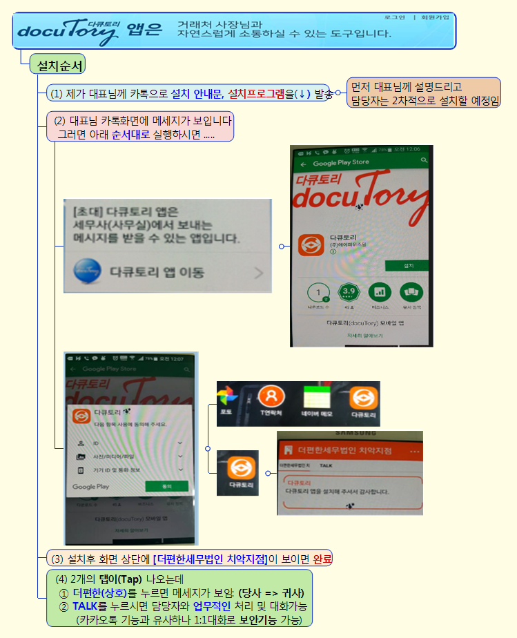 (설치순서 및 전달내용) -1차적으로 대표님 : 사회정보, 경영정보, 세무상 주요내용등 필수내용을 도해중심으로 쌍방소통 -2차적으로 담당자 : 필요한 경영정보, 세무상 주요내용, 의뢰 업무중심으로 쌍방소통 |